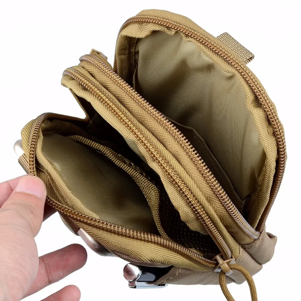 This compact yet versatile tactical waist pouch is crafted from durable 600D waterproof nylon, perfect for outdoor activities like hiking, camping, cycling or EDC use. It features two zippered compartments, a phone holster with a secure buckle, MOLLE-compatible rear loops, and organized inner layers to hold your essentials like phones, pens, flashlights, wallets, and more.